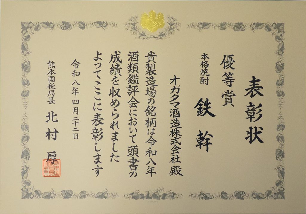 熊本国税局令和8年酒類鑑評会にて、本格焼酎部門の一般酒の部で「鉄幹」、炭酸割の部で「鉄馬」が優等賞を受賞いたしました。